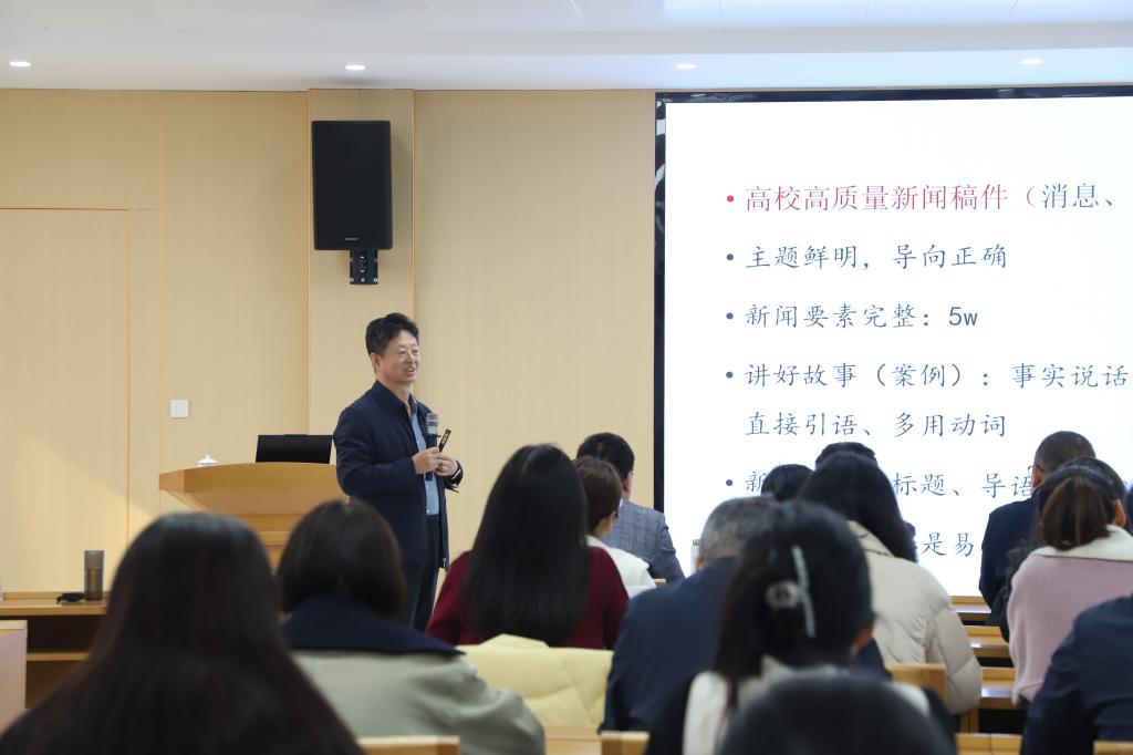 宋全政以“全媒体时代高校如何产出高质量校园新闻”为题,凭借其深厚的理论素养和多年深耕教育新闻领域的丰富实践经验,从宏观趋势到微观实操,全面剖析了当前高校新闻宣传工作面临的新形势、新挑战与新要求。他首先深入阐释了“全程媒体、全息媒体、全员媒体、全效媒体”的时代特征,指出在“四全媒体”格局下,高校新闻宣传已进入“价值引领、内容为王、融合传播、效能导向”的新阶段。宋全政强调,高校宣传工作的破局关键在于“挖掘”与“呈现”,并结合大量生动案例,分析了融媒体报道的策划与执行要点。他提出,高校新闻要着力从“深度”“温度”和“趣度”三个维度挖掘新闻价值,要善于将学校的中心工作、宏大叙事转化为具有思想启迪、人文关怀和传播活力的精彩故事。本次培训内容详实、逻辑清晰、视角前沿,既有理论高度,又紧贴高校新闻宣传工作实际。