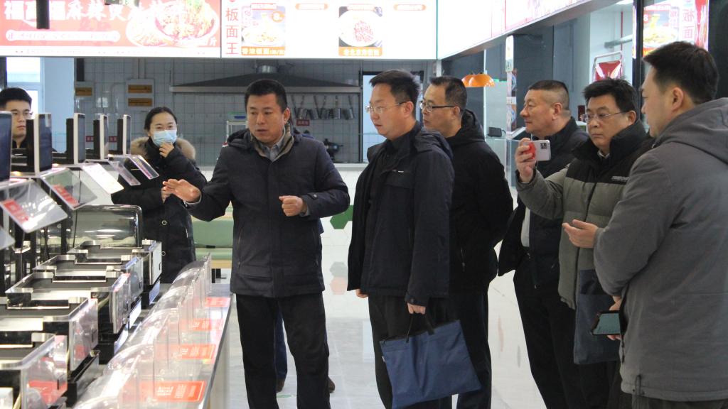 考察过程中,李光武介绍了我校餐厅的运行机制、监督管理体系建设情况,并系统阐述了智慧餐厅建设的背景、目标规划与阶段性成果,展现了我校以数字化转型推动后勤服务提质增效的创新实践。李新对我校餐厅的运营模式与监管机制给予高度评价。他表示,智慧餐厅通过智能化选餐优化了就餐流程,依托高品质食材供应体系夯实了饮食保障,借助功能化营养搭配服务提升了师生就餐体验,相关经验具有重要的借鉴意义和推广价值。