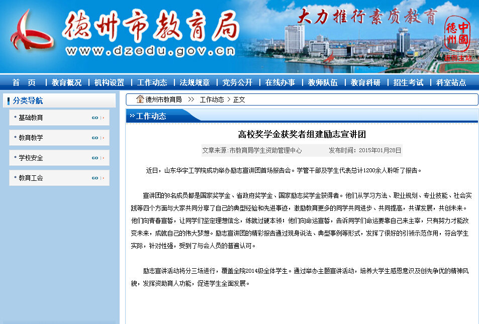 2015年01月28日,德州市教育局网站以《高校奖学金获奖者组建励志宣讲团》为题报道我院励志宣讲团活动情况。