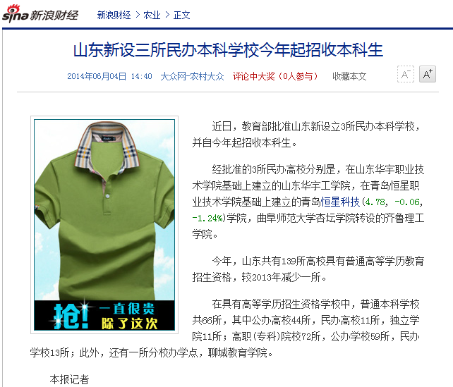 上一条: 凤凰网:教育部批准山东新设3所民办本科学校 今年招生